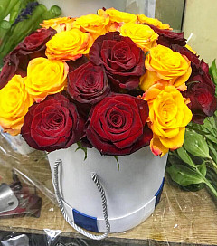Эта коробка будет прекрасным подарком на юбилей или любой другой праздник. Такое сочетание роз напоминает солнечную осень.